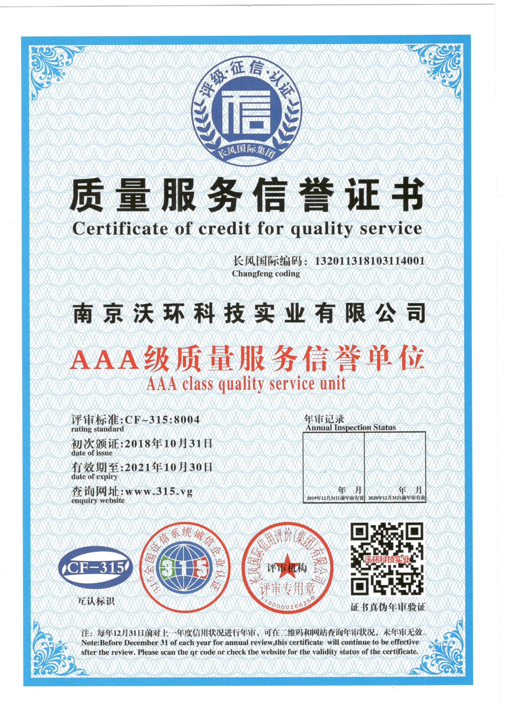 熱烈祝賀南京沃環(huán)公司被專業(yè)評審機(jī)構(gòu)-長風(fēng)國際集團(tuán)評為AAA級質(zhì)量服務(wù)信譽,特發(fā)此證書