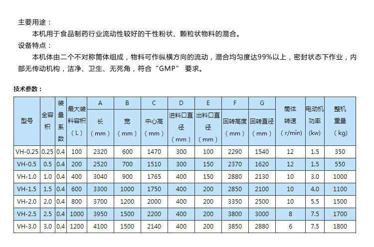 本機適用于制藥、化工、食品的干粉狀、顆粒裝物料的混合。該機混料筒結(jié)構(gòu)獨特,混合均勻,效率高,不積料。整機結(jié)構(gòu)簡單,操作容易。外表面和物料接觸部分均采用優(yōu)質(zhì)不銹鋼制造,造型美觀,維護、清洗方便。